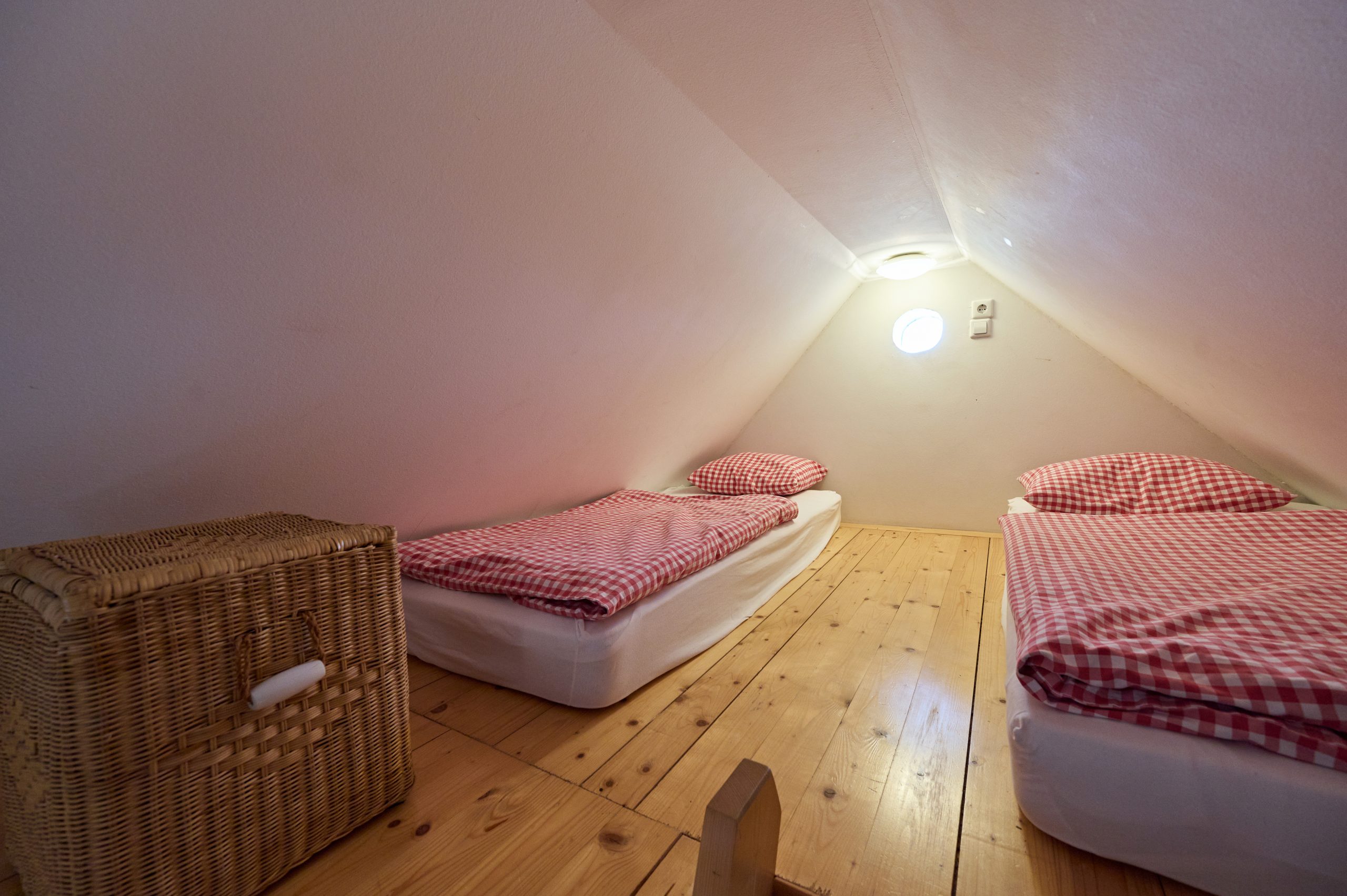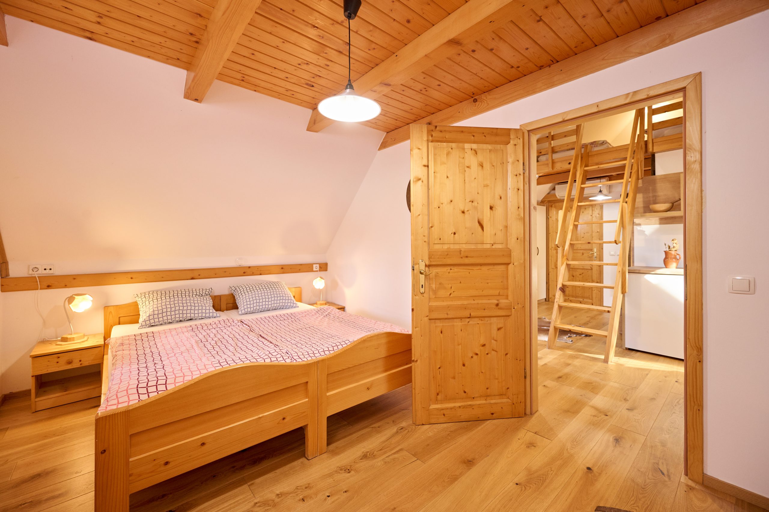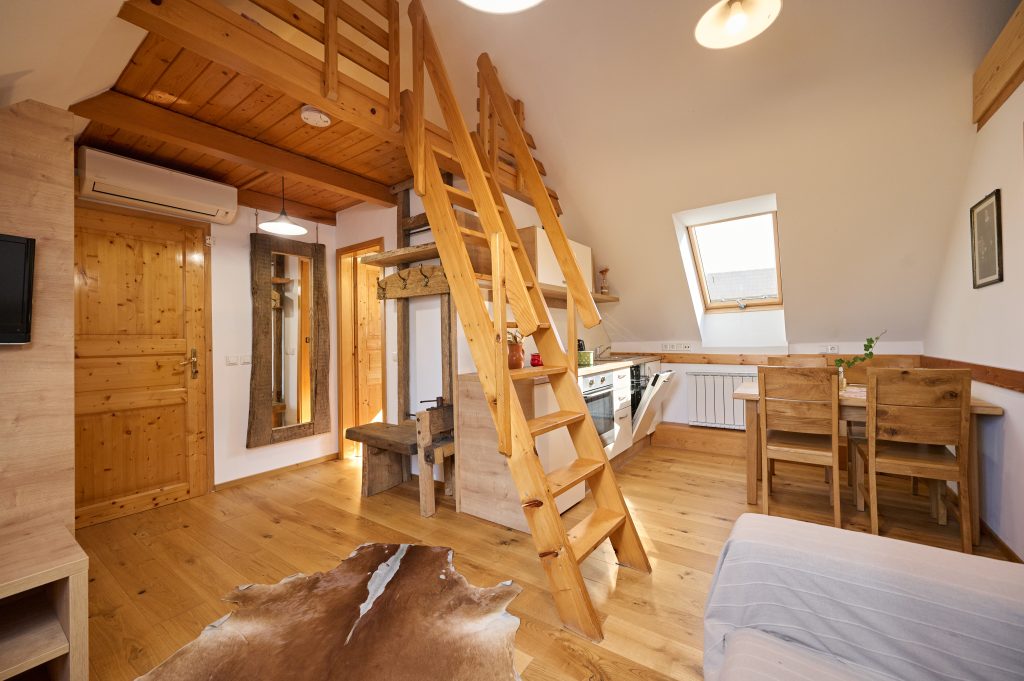 Udobno spanje omogoča 5 postelj – dve zakonski postelji (širine 180 cm ) in dodatno ležišče v izmeri 90 cm. Apartma se nahaja v dveh nivojih.