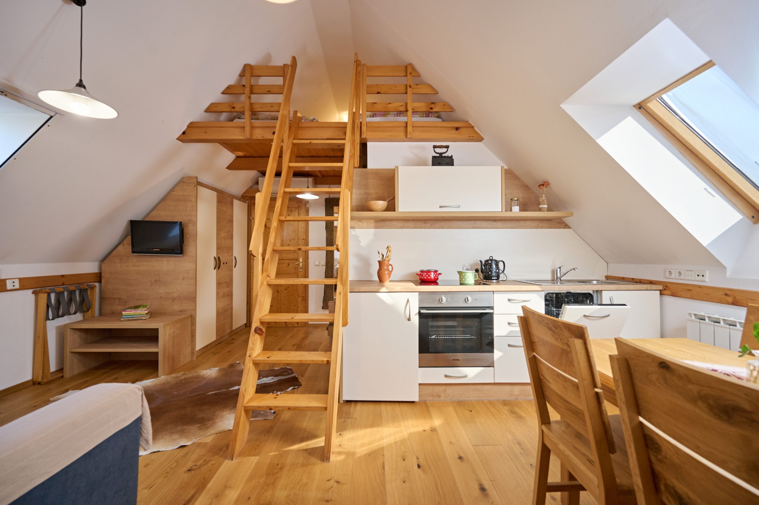 Apartma številka 9 obsega 32 m2. V kolikor ne boste uživali v večerji iz lokalnih sestavin, ki jo pripravimo na terasi pod apartmajem, vam polno opremljena kuhinja omogoča, da si pripravite kosilo ali večerjo po vašem okusu. Prostorna kuhinja je opremljena s pečico, pomivalnim strojem, posodo, priborom in krožniki. Vključuje tudi hladilnik in grelnik vode. Pripravljeno hrano lahko pojeste v jedilnem kotu.