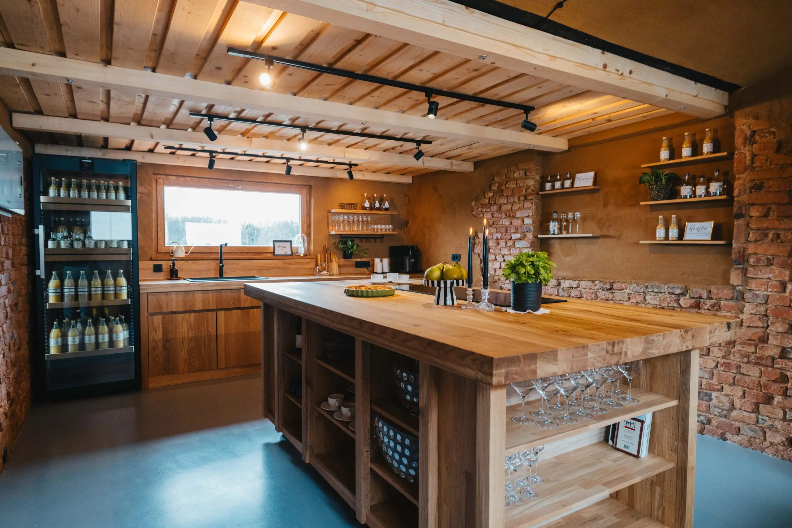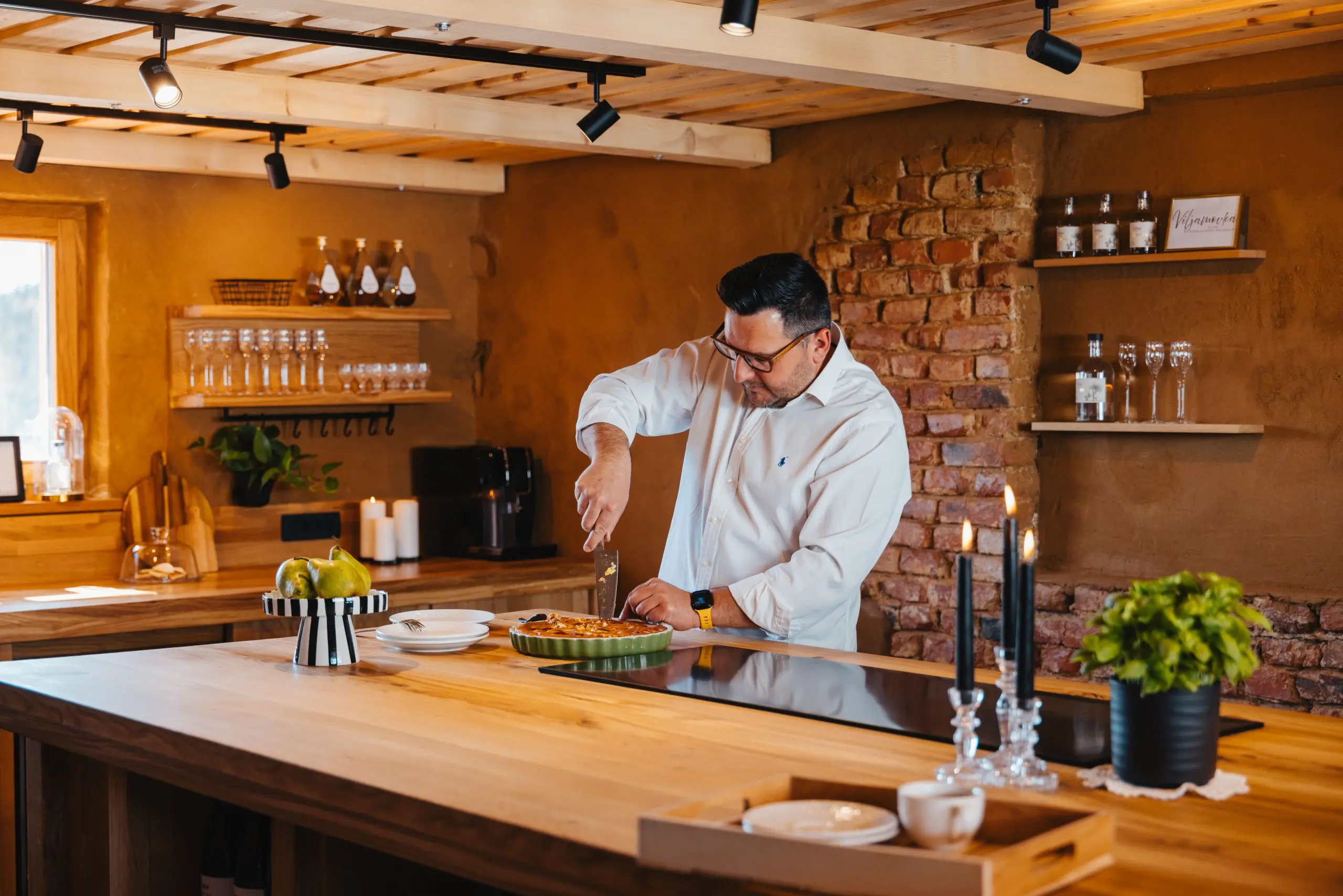 Na desni strani osrednjega prostora je sodobno opremljena kuhinja v rustikalnem slogu. Namenjena je manjšim pogostitvam ali kuharskim delavnicam, kjer se gostje lahko tudi sami preizkusijo v pripravi jedi in spoznajo uporabo hruške v kulinariki.