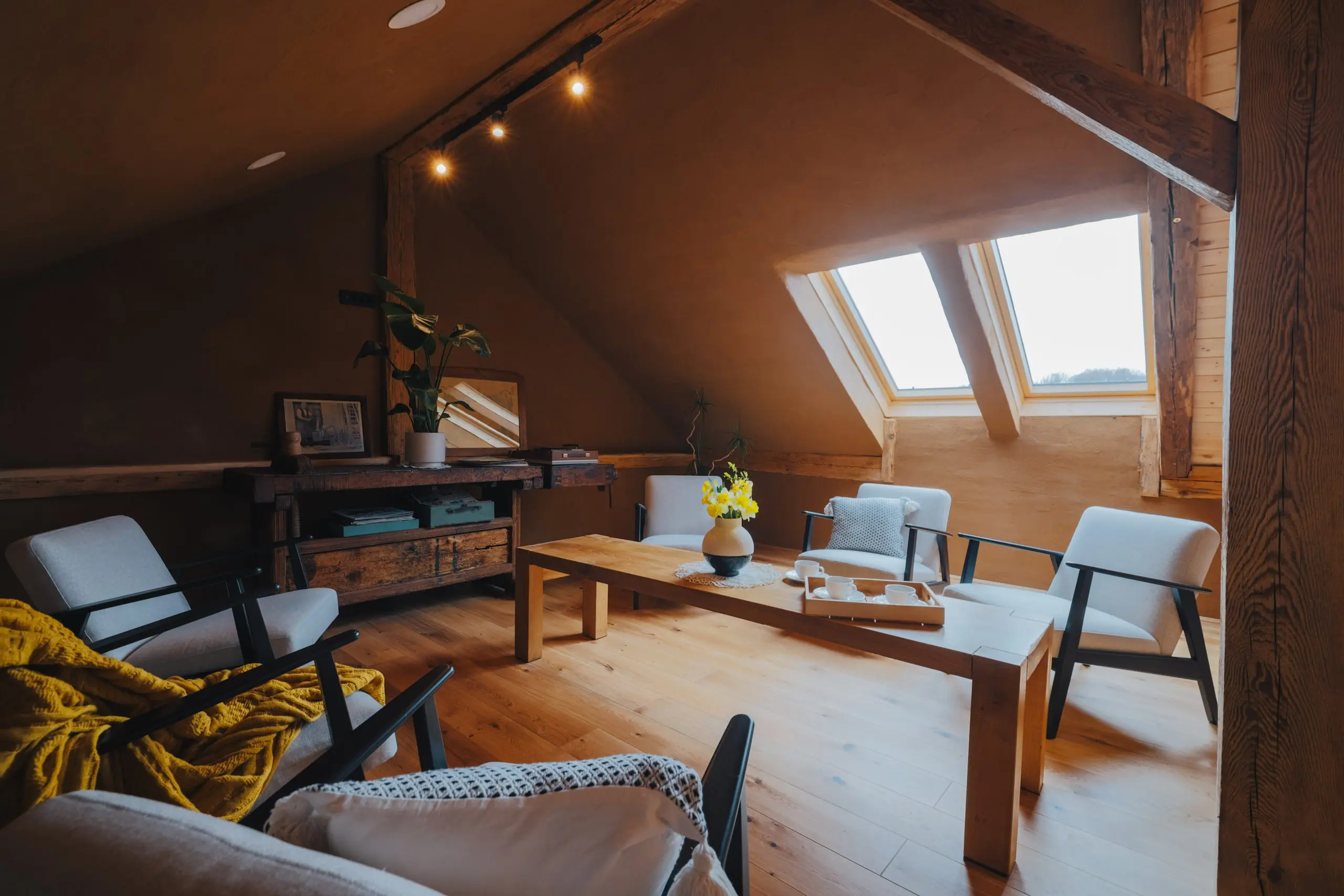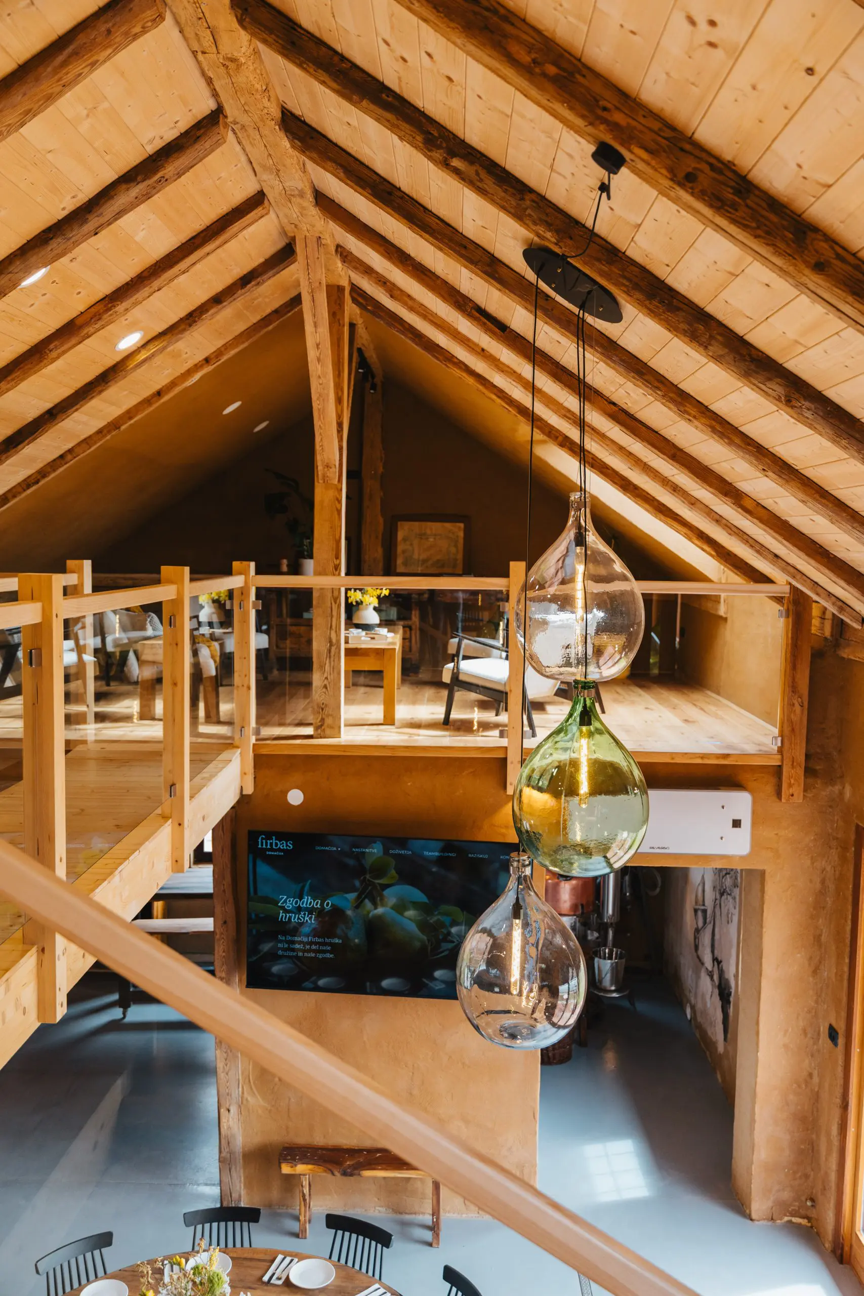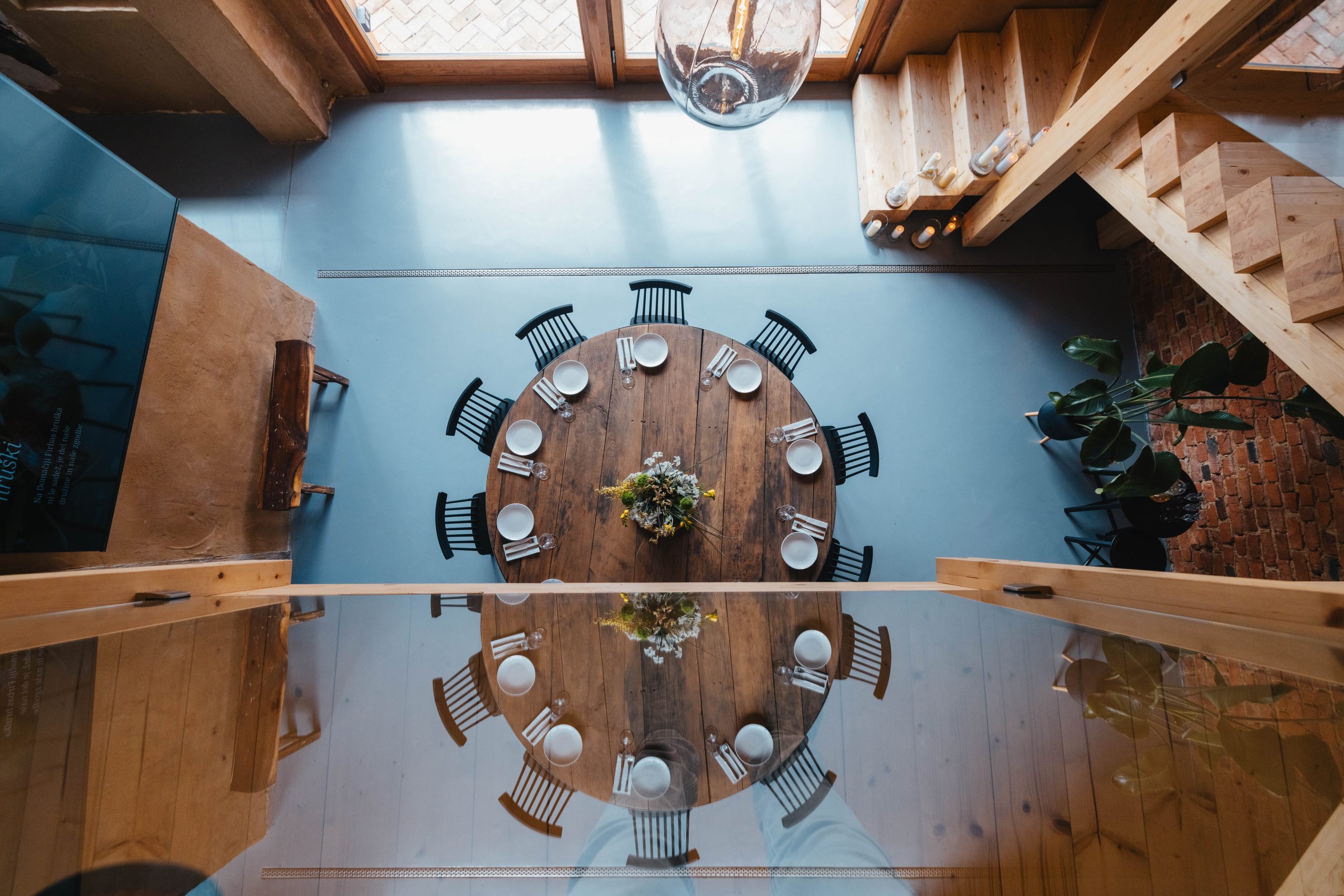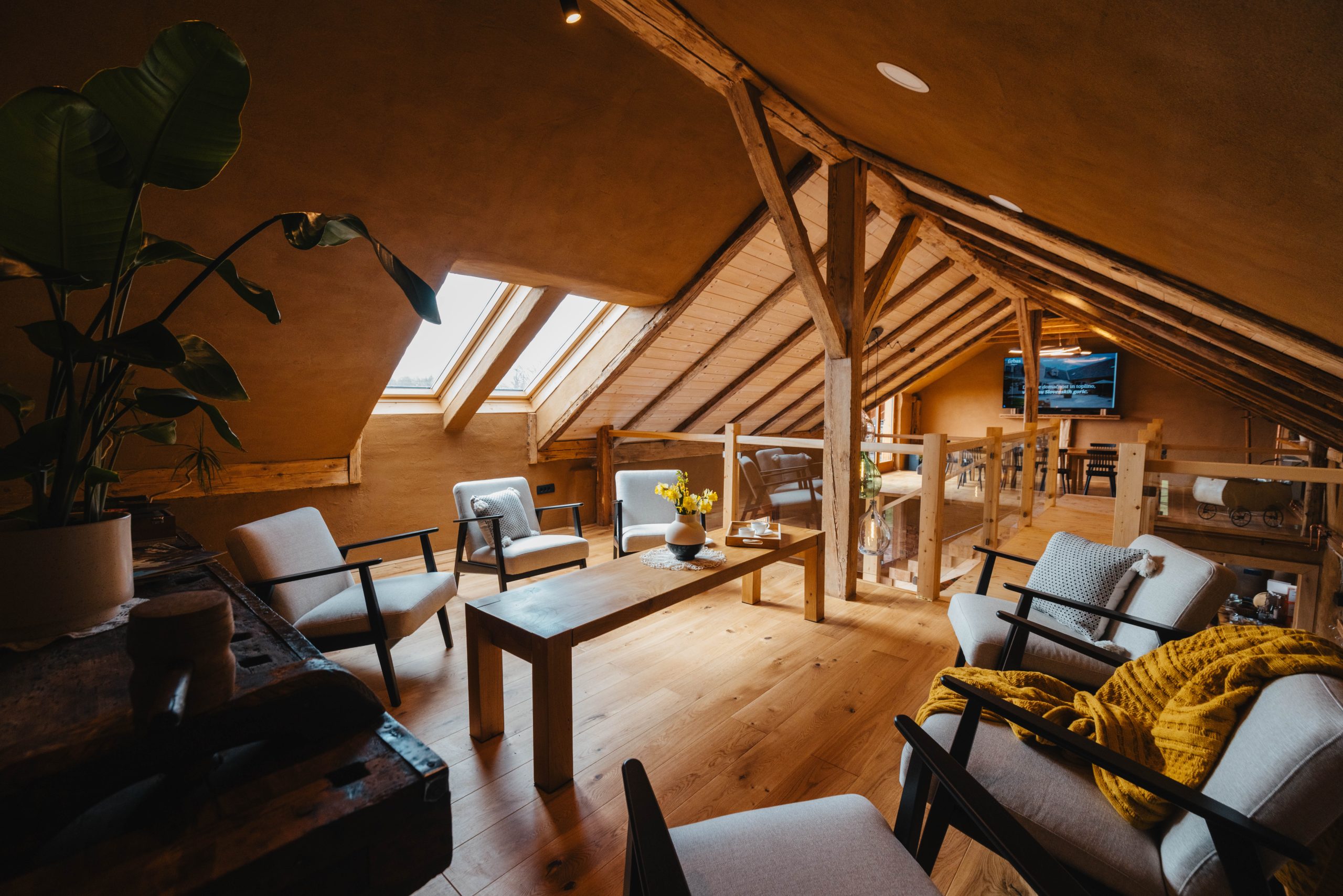 Iz osrednjega prostora vodijo lesene stopnice v zgornji del objekta. Te stavbi dajejo poseben značaj in vodijo v seminarsko sobo, namenjeno poslovnim sestankom, delavnicam ali preprosto druženju v manjšem krogu. Posebno pozornost namenjamo diskretnosti – objekt omogoča mirno okolje, kjer se lahko srečanja odvijajo nemoteno in z veliko mero zasebnosti.