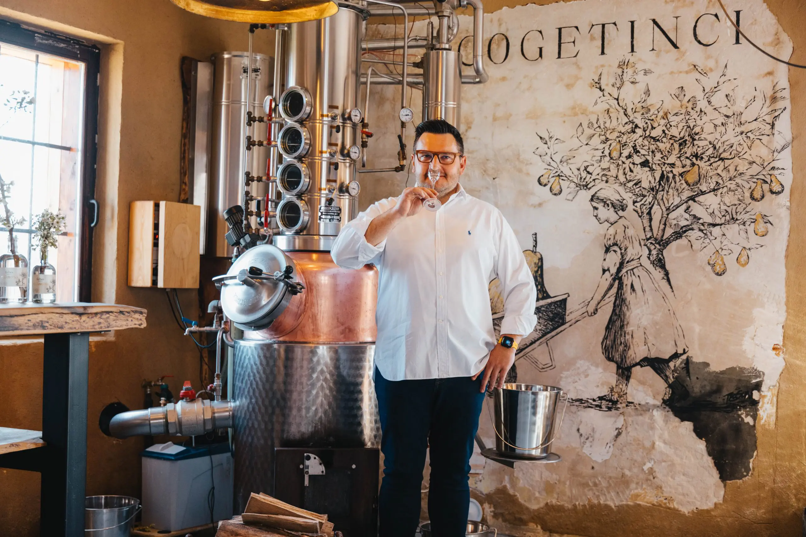 Ko vstopimo v objekt, se znajdemo v osrednjem prostoru, ki je srce celotne predstavitve. Namenjen je pripovedovanju zgodbe o hruški, podprte z video vsebino, ki obiskovalcu omogoča lažje razumevanje procesa in ozadja. Levo od osrednjega prostora se nahaja destilacijski kotel, kjer je mogoče nazorno predstaviti postopek destilacije hrušk in razložiti, kako iz sadja nastane žganje.